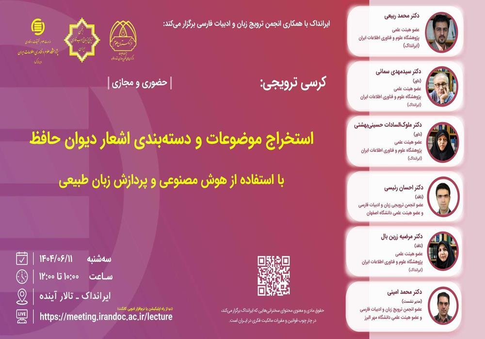 کرسی ترویجی ایرانداک با موضوع «استخراج موضوعات و دستهبندی اشعار دیوان حافظ با استفاده از هوش مصنوعی و پردازش زبان طبیعی»